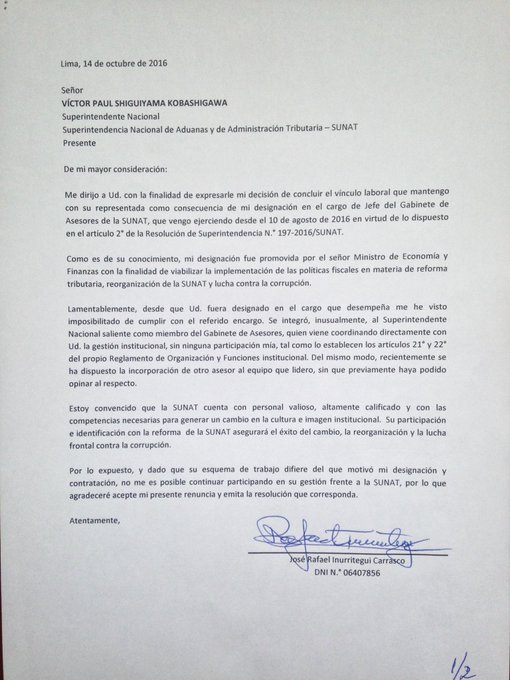 La Carta De Renuncia Del Ex Jefe De Asesores De Sunat: "no via www.apam-peru.com